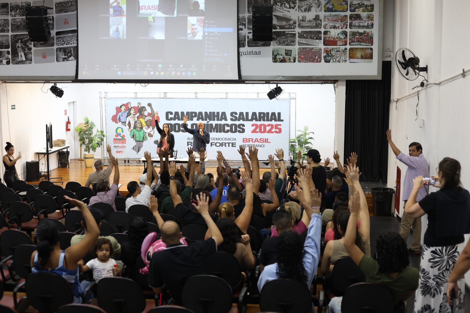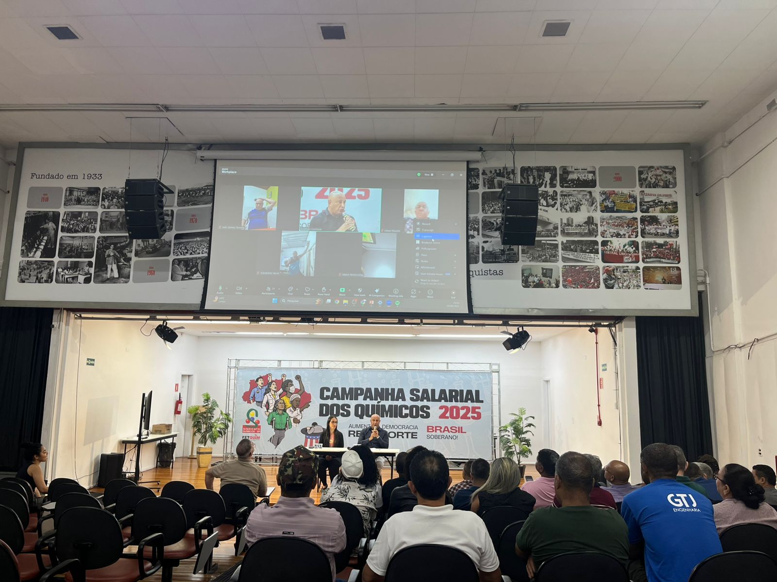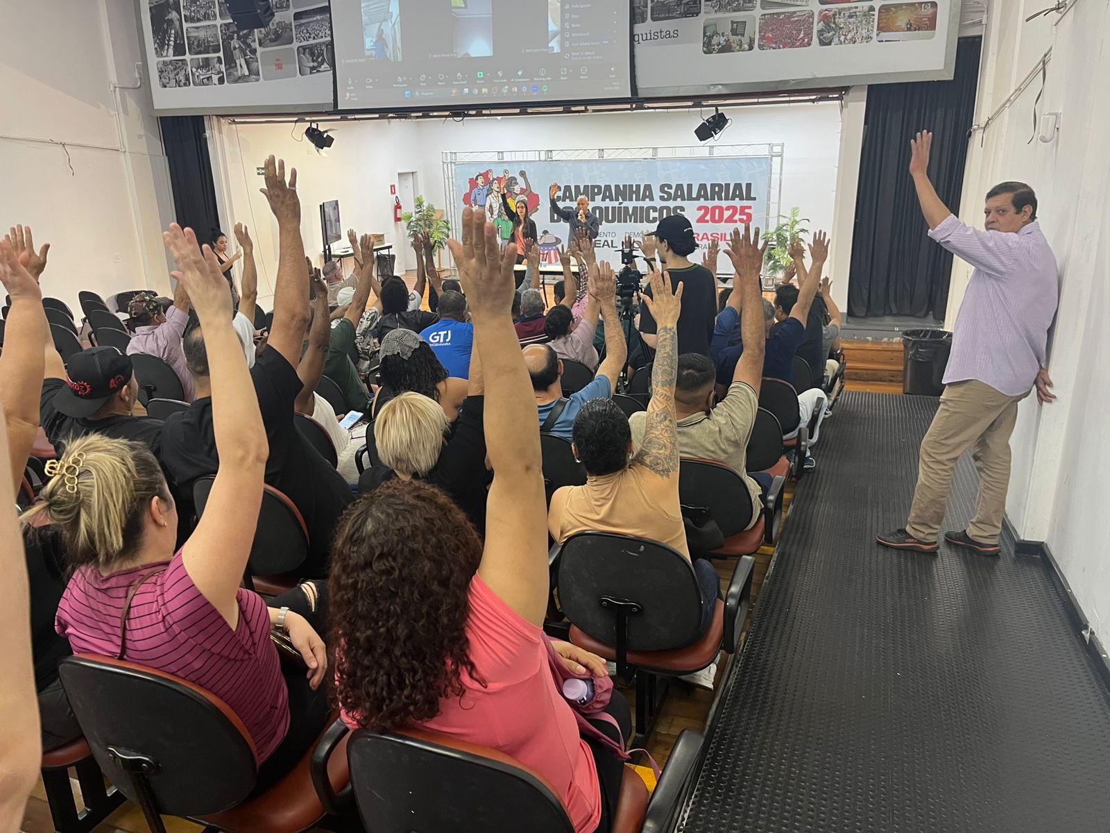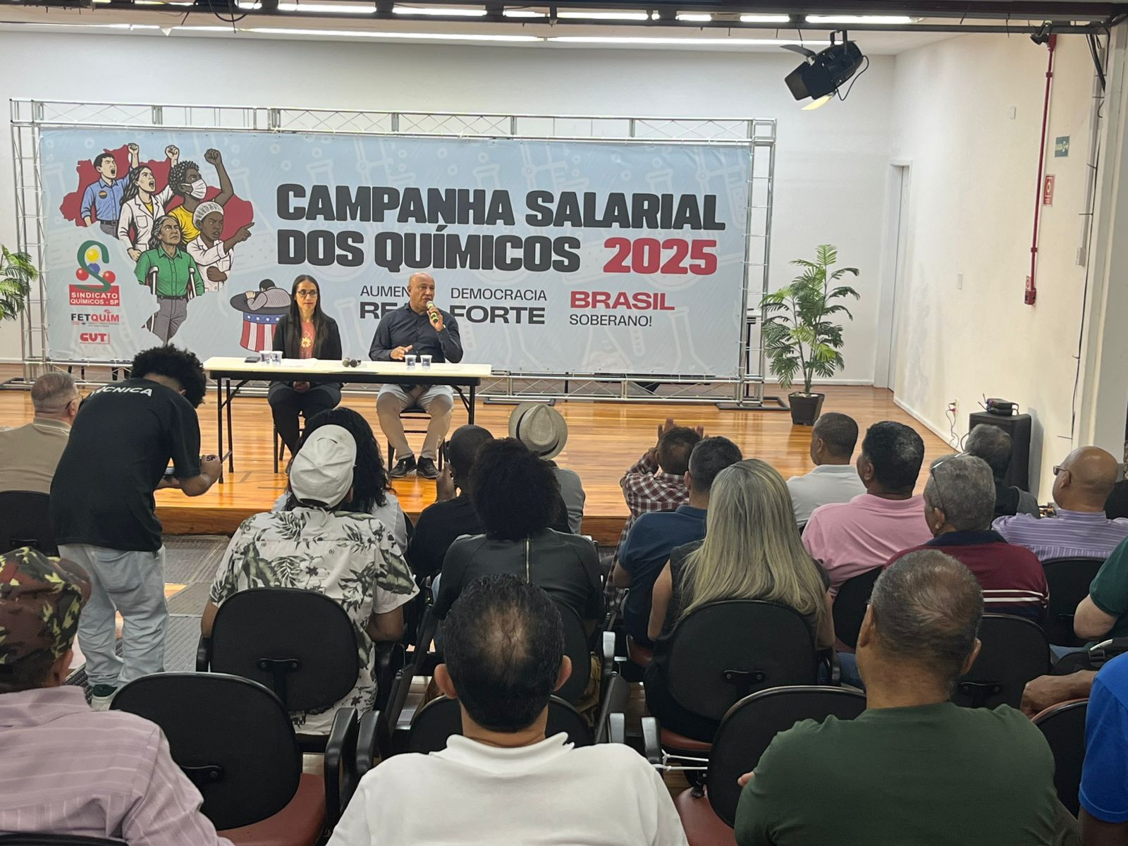 Postado em: 19/09/2025 - Campanha Salarial dos Químicos 2026 Assembleia do setor Químico aprova pauta que será entregue à bancada patronal em 6 de outubro Fotos: Soraia Nigro e Mateus Fernandes Compartilhar Twettar